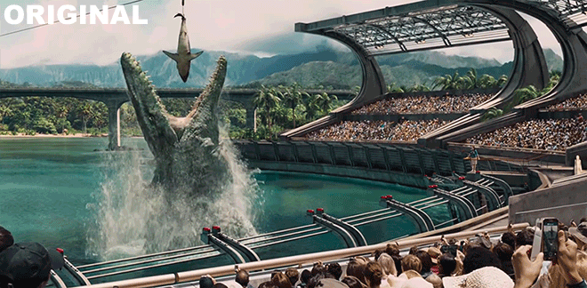 Il y a quelques mois, la toue première bande annonce de Jurassic World avait été critiquée sur la toile par de nombreux fans à cause de quelques effets visuels pas totalement finalisés, et donc pas jolis jolis. Un message qui est visiblement arrivé jusqu'aux oreilles de la production du film, puisque pour les besoins du nouveau trailer du film (diffusé dimanche durant le Super Bowl et visible en bas de page) quelques plans truqués ont été sévèrement améliorés ! La preuve avec les deux GIF ci-dessous qui nous montrent deux versions des mêmes screenshots... Aviez-vous remarqué les ptérodactyles rajoutés ?