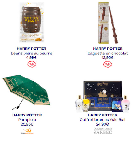 Ou encore des légendaires beans bière au beurre (des bonbons au goût de la boisson préférée des élèves de Poudlard), une baguette Harry Potter en chocolat, un parapluie Harry Potter ou un coffret de brume pour se parfumer à l'odeur de magie.