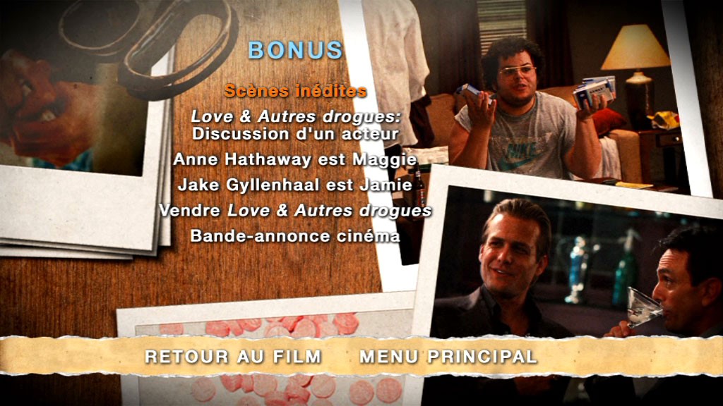 Si ce n’est pas avec Love et autres drogues que vous risquez d’ennuyer votre voisinage, les mixages Dolby Digital 5.1 anglais, français et espagnols livrés par l’éditeur n’en demeurent pas moins énergiques et ce grâce à une bande-originale particulièrement brillante renvoyant à certains gros tubes des années 90 (le film se passe en 1996) comme la célèbre Macarena ou d’autres tubes de Garbage. C’est donc évidemment la musique qui est judicieusement et ardemment spatialisée sur l’ensemble des enceintes. Les arrières délivrent quelques ambiances naturelles et soutiennent fougueusement la bande-son, tandis que les voix sont solidement plantées sur l’enceinte centrale et que le caisson de basses se mêle frénétiquement à la partie. L’activité frontale est quant à elle limpide, ample et souvent percutante.